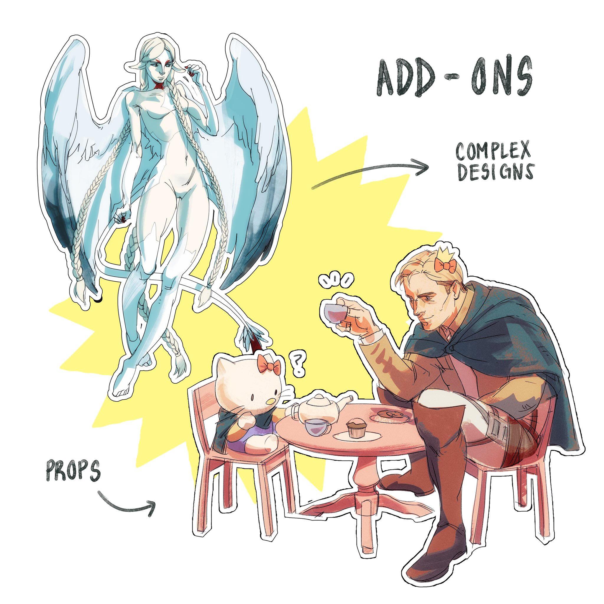 every commission type includes a flat color backdrop or simple shapes upon request, scenic backgrounds are available with an additional charge depending on the complexity